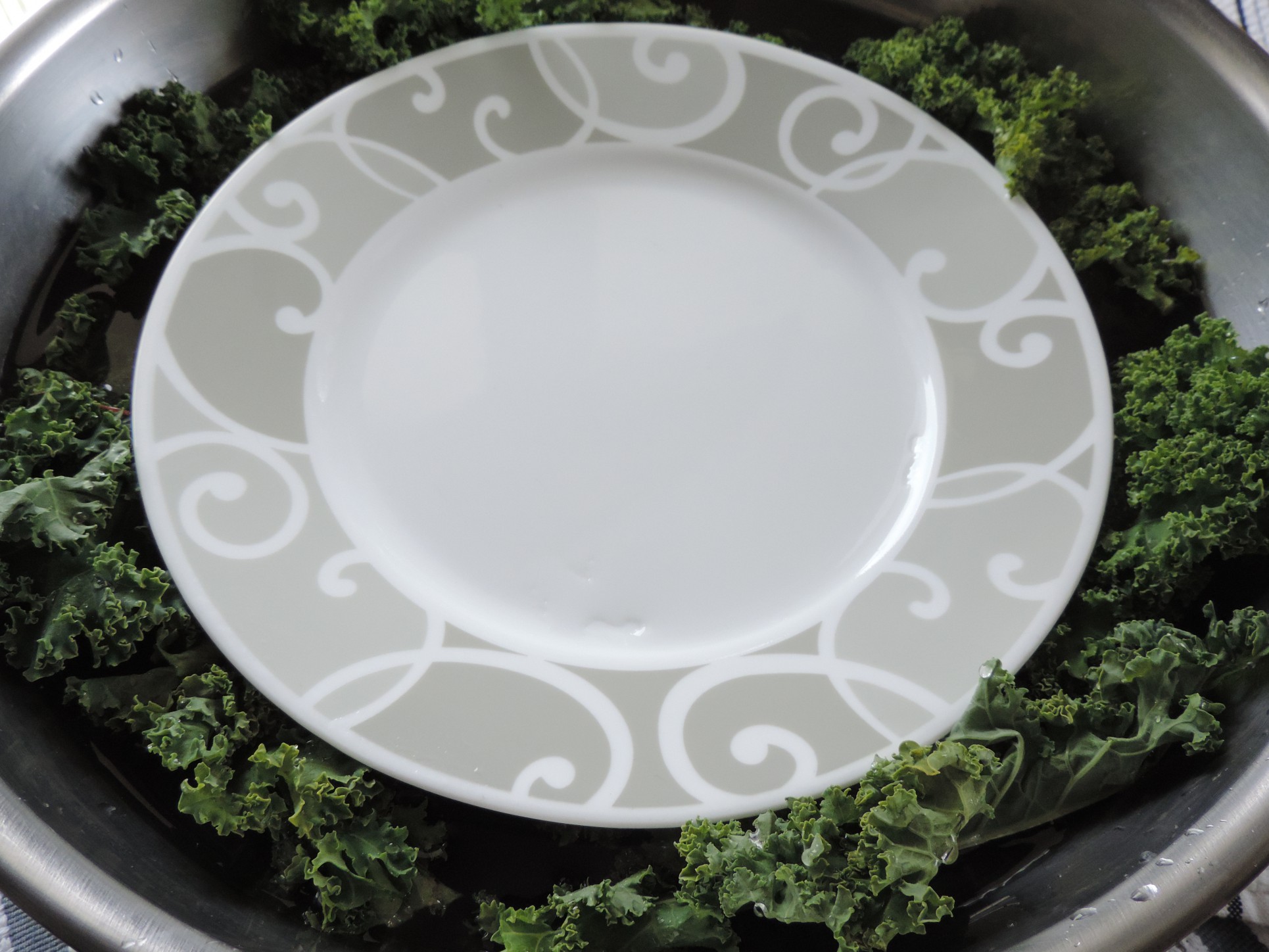 Once all your kale or chard is cut, you want to insure the leaves stay submersed, especially the stem tips. A plate usually does the trick. Although, if I have too many leafy greens in one batch, I’ve been known to set a wide bowl or a large pie dish with water to hold the leaves down.