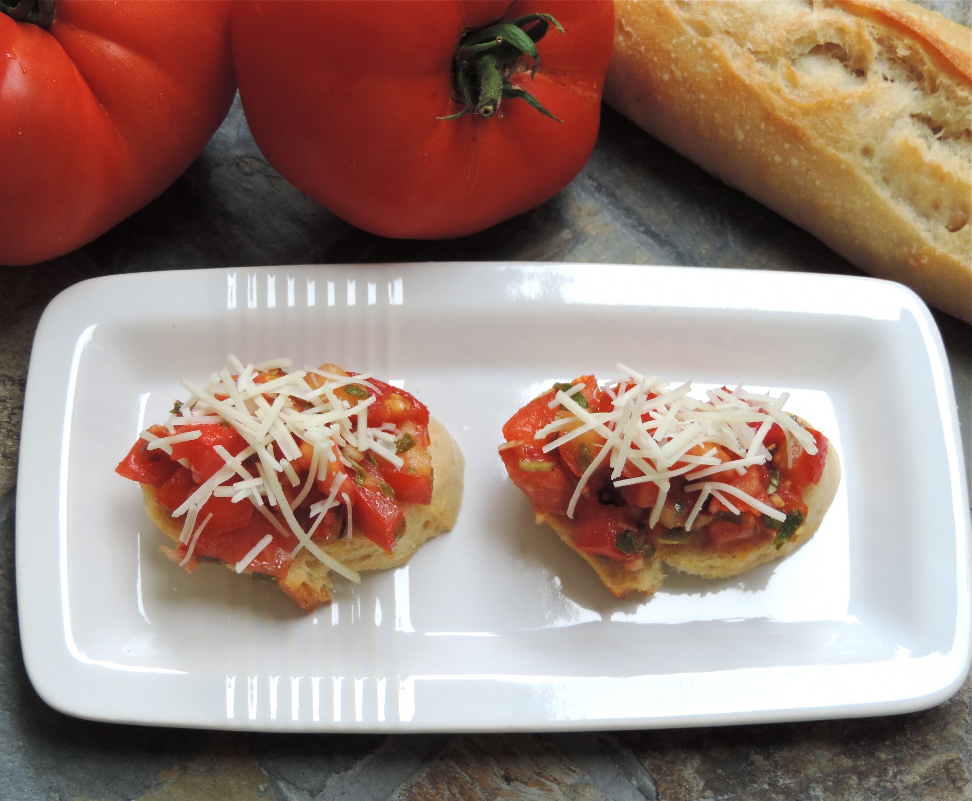 Bruschetta is commonly made with the lesser juicy Roma tomatoes, however, that’s not what I have a kitchen counter full of. I use a fork or a slotted spoon to serve the tomatoes on the toasted baguette. The flavor is so good, I find myself pouring a little of the tomato juice on my bread anyways. I don’t want to miss a drop of these yummy flavors!