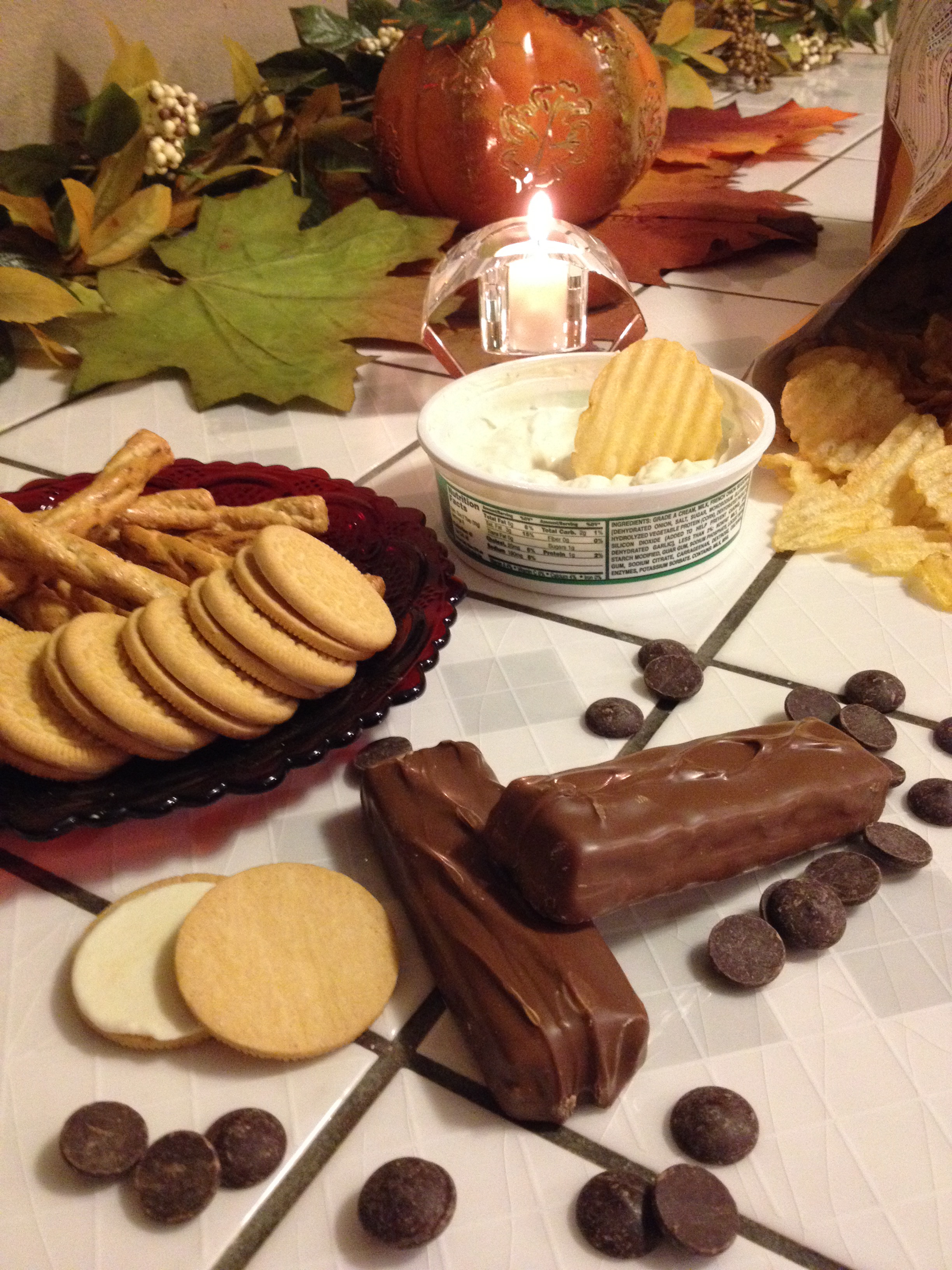 A candle is lit in the center of the tiled table. She pulls out the candy bars secretly stashed away. Only one at a time, just in case someone interrupts. She proceeds to eat two full-size candy bars. Her sweet tooth is satisfied, but she does not feel any better. She thinks, maybe if I eat some chips and onion dip, that always tastes good. She associates onion dip with childhood picnics—comfort food. Crunch, crunch, crunch the anxiety away.